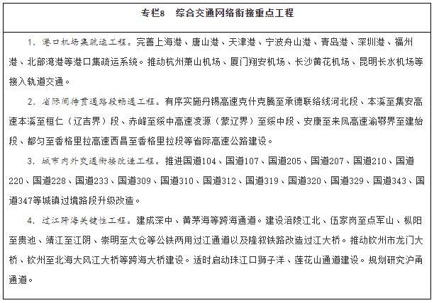 加快解决制约人民美好出行、货物高效流通的瓶颈,强化综合交通网络有机衔接。打通公路省际待贯通路段,加强干线公路与城市道路有效衔接,推进城镇密集地区干线公路过境段、进出城瓶颈路段升级改造。加强枢纽机场与轨道交通高效衔接,使换乘更加便捷。强化进港区、进园区、进厂区、进规模化农产品基地等集疏运设施建设,加快推动铁路进港口重点港区和大型工矿企业、物流园区、重点物资储备库。统筹考虑资源高效利用、生态环境保护和防洪航运安全,有序建设各种运输方式共享通道资源的过江跨海通道。推动超大特大城市的大型综合客运枢纽间通过轨道交通互连。加快实现联系紧密的综合货运枢纽间通过联络线或专用通道互连。