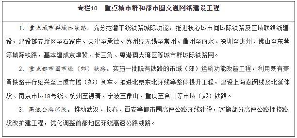 强化重点城市群城际交通建设。围绕京津冀、长三角、粤港澳大湾区、成渝、长江中游等城市群,以轨道交通、高速公路为骨干,提升城际运输通道功能,加强核心城市快速直连,构建多节点、网络化的城际交通网,实现城市群内主要城市间2小时通达。整体推进京津冀、长三角、粤港澳大湾区城际铁路和市域(郊)铁路建设,有序推动成渝地区双城经济圈城际铁路和市域(郊)铁路建设,加强与高速铁路、普速铁路一体衔接,扩大对5万人口以上城镇的有效覆盖。