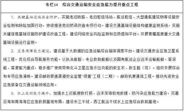 健全综合交通运输应急管理体制机制,完善应急协调机制和应急预案体系,加强交通运输调度与应急指挥平台建设。推进区域性公路应急装备物资储备中心建设。加强水上交通安全监管、航海保障和救助打捞能力建设,完善沿海和内河溢油应急设备库,构建陆海空天一体化水上交通运输安全保障体系。建设城市轨道交通应急演练中心。以骨干航空物流企业为主体构建航空应急服务网络。建设海事监管指挥系统。在开展城市交通基础设施地下空间、低洼区域、重点区段、重要点位、关键设施等隐患排查基础上,建立健全风险台账和灾害隐患清单,补齐设施设备、应急抢险物资等短板,持续完善应急处置预案,健全应急响应机制,提升应对极端天气能力。加强应急专业队伍和志愿者队伍建设,充实国家应急运输储备力量。健全应对重大疫情、防范应对恐怖袭击、保障信息安全等非传统安全应急指挥体系和应急交通组织。