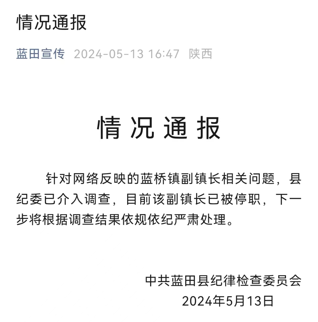 5月13日上午,一则“西安一副镇长半夜叫人家妻子唱歌,因为人家孩子发烧被拒绝,半夜12点半竟然敲门拜访”的网传视频,引发广泛关注。5月13日,中共蓝田县纪律检查委员会发布情况通报:针对网络反映的蓝桥镇副镇长相关问题,县纪委已介入调查,目前该副镇长已被停职,下一步将根据调查结果依规依纪严肃处理。(中国青年报、蓝田宣传微信公众号)