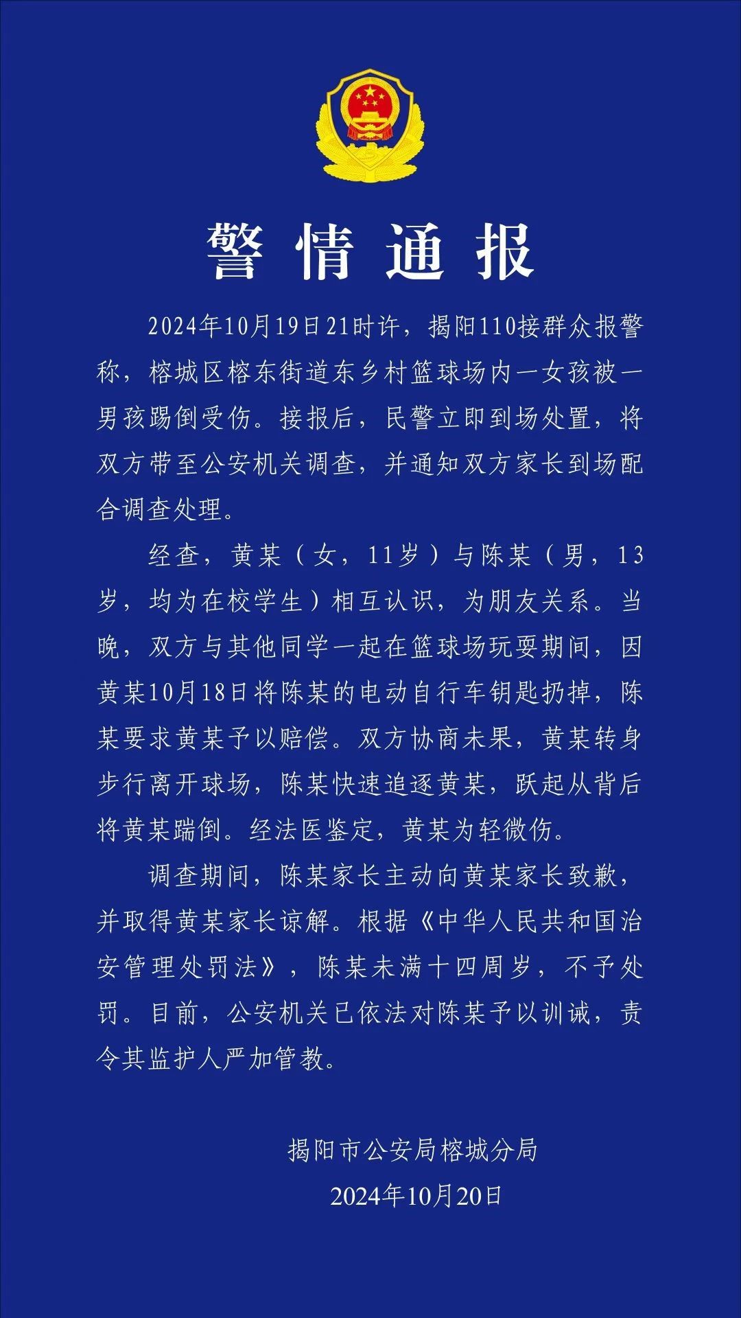 近日,“男孩在篮球场上飞脚从背后踹倒女孩”的视频在网络上引起广泛关注。10月20日晚,广东省揭阳市公安局榕城分局就该事件发布情况通报:根据《中华人民共和国治安管理处罚法》,由于踢人男孩陈某未满十四周岁,不予处罚。目前,公安机关已依法对陈某予以训诫,责令其监护人严加管教。(央广网、“平安榕城”微信公众号)