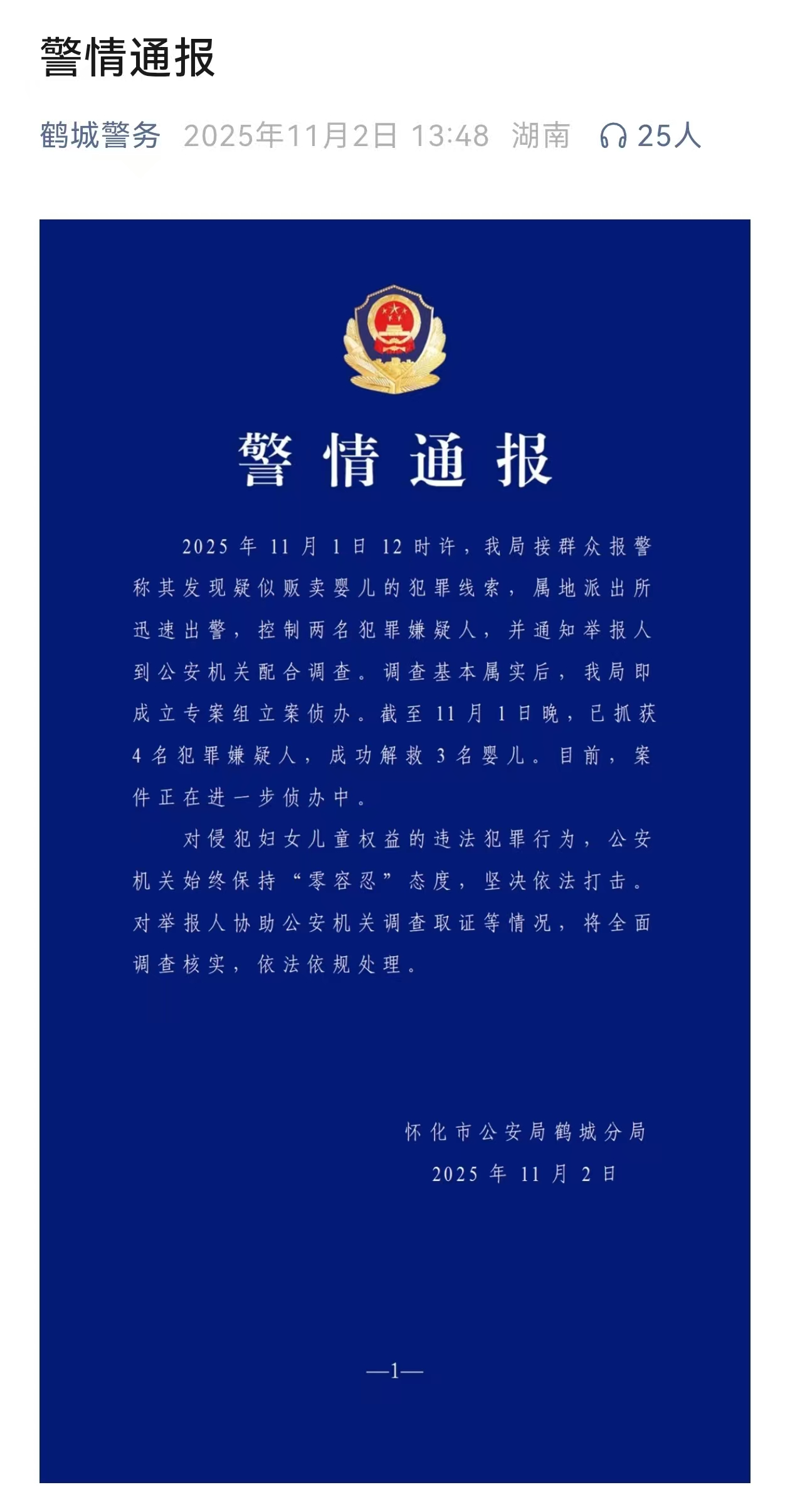 11月2日,湖南省怀化市公安局鹤城分局发布警情通报:11月1日12时许,鹤城分局接群众报警称其发现疑似贩卖婴儿的犯罪线索,属地派出所迅速出警,控制两名犯罪嫌疑人,并通知举报人到公安机关配合调查。调查基本属实后,鹤城分局即成立专案组立案侦办。截至11月1日晚,已抓获4名犯罪嫌疑人,成功解救3名婴儿。目前,案件正在进一步侦办中。警方表示,对侵犯妇女儿童权益的违法犯罪行为,公安机关始终保持“零容忍”态度,坚决依法打击。对举报人协助公安机关调查取证等情况,将全面调查核实,依法依规处理。(光明网)