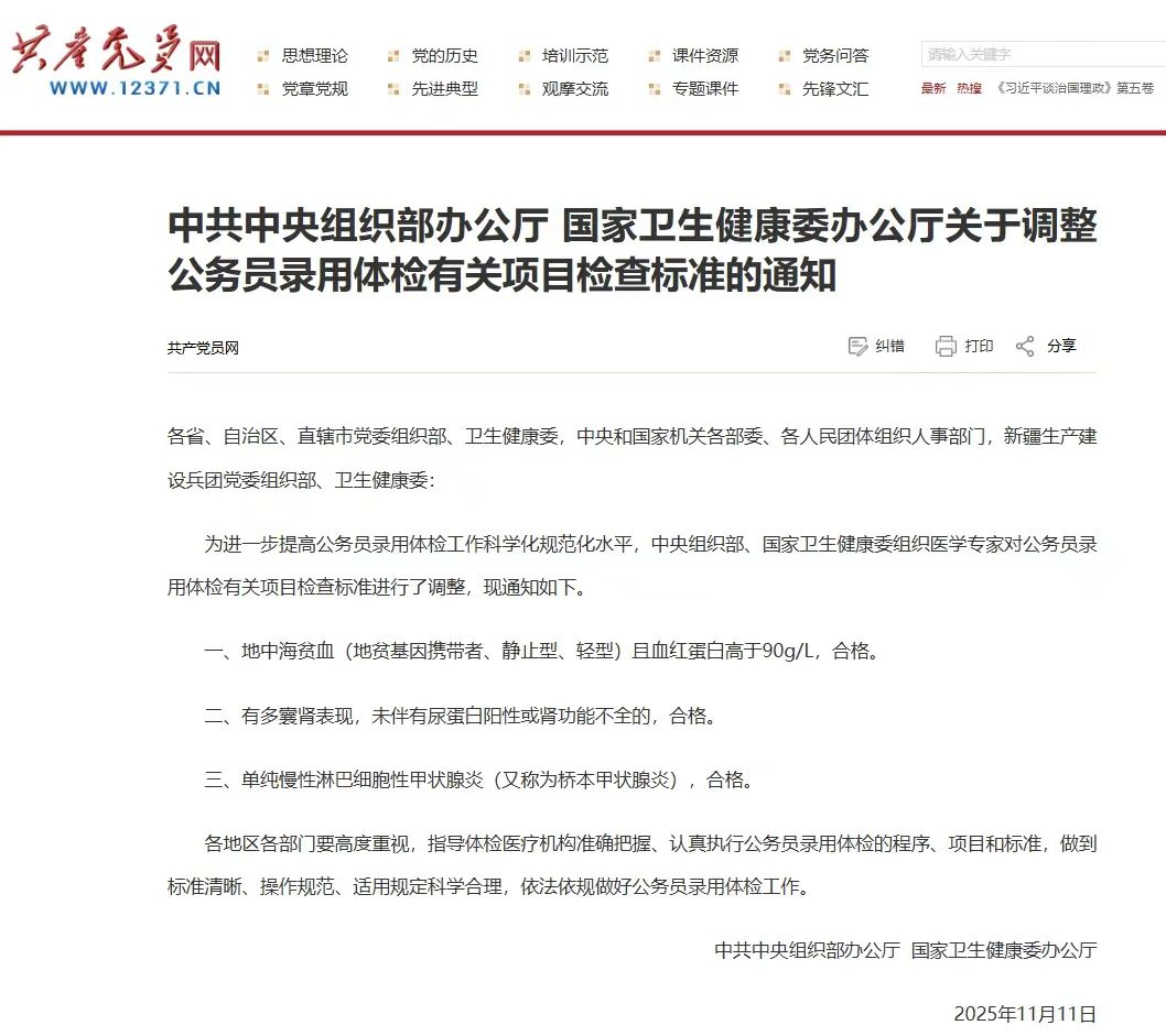 1.公务员录用体检标准放宽,这些人可以考公了:近日,中共中央组织部办公厅、国家卫生健康委办公厅发布《关于调整公务员录用体检有关项目检查标准的通知》。详情如下↓(共产党员网)