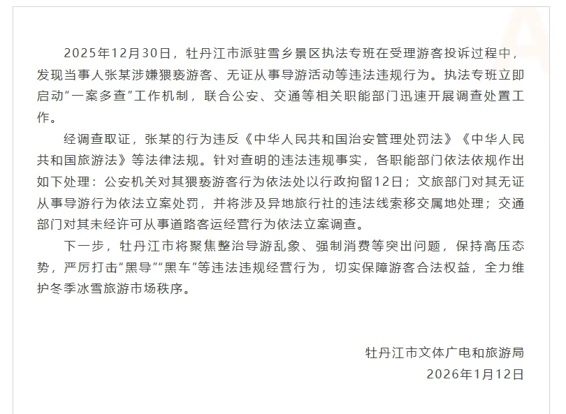 13日,黑龙江省牡丹江市文体广电和旅游局发布情况通报称,2025年12月30日,牡丹江市派驻雪乡景区执法专班在受理游客投诉过程中,发现当事人张某涉嫌猥亵游客、无证从事导游活动等违法违规行为。执法专班联合公安、交通等相关职能部门迅速开展调查处置工作。经调查取证,张某的行为违反《中华人民共和国治安管理处罚法》《中华人民共和国旅游法》等法律法规。针对查明的违法违规事实,公安机关对其猥亵游客行为依法处以行政拘留12日;文旅部门对其无证从事导游行为依法立案处罚,并将涉及异地旅行社的违法线索移交属地处理;交通部门对其未经许可从事道路客运经营行为依法立案调查。(工人日报)