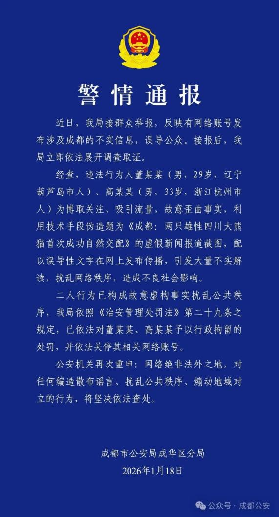18日,四川省成都市公安局成华区分局发布警情通报。近日,该局接群众举报,反映有网络账号发布涉及成都的不实信息,误导公众。经查,违法行为人董某某、高某某为博取关注、吸引流量,故意歪曲事实,利用技术手段伪造题为《成都:两只雄性四川大熊猫首次成功自然交配》的虚假新闻报道截图,配以误导性文字在网上发布传播,引发大量不实解读,扰乱网络秩序,造成不良社会影响。二人行为已构成故意虚构事实扰乱公共秩序,该局依法对董某某、高某某予以行政拘留的处罚,并依法关停其相关网络账号。(光明日报)