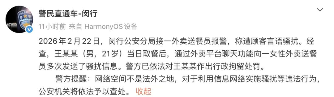 2月26日晚,@警民直通车-闵行发布警情通报:2月22日,闵行公安分局接一外卖送餐员报警,称遭顾客言语骚扰。经查,王某某(男,21岁)当日取餐后,通过外卖平台聊天功能向一女性外卖送餐员多次发送了骚扰信息。警方已依法对王某某作出行政拘留处罚。警方提醒:网络空间不是法外之地,对于利用信息网络实施骚扰等违法行为,公安机关将依法予以查处。(中国青年报、@警民直通车-闵行)
