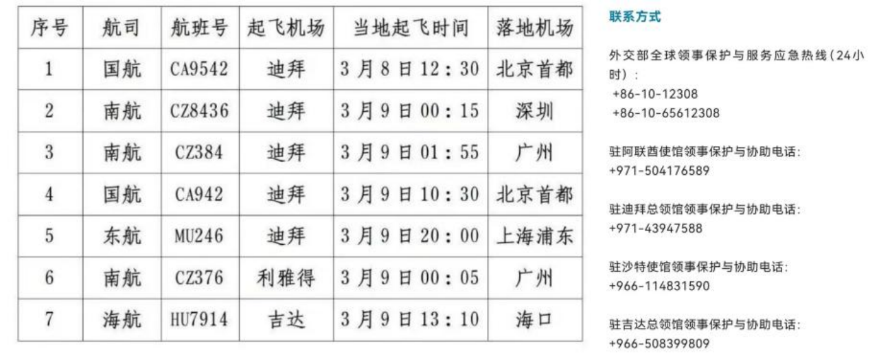 3.CZ8436等航班还有票!外交部紧急提醒:连日来,外交部和中国民航局全力协调,紧急派出航班协助滞留中东地区中国旅客回国。据了解,以下航班尚有余票。外交部领事保护中心建议,滞留中东地区的中国旅客抓紧时间通过以下航班回国,可登录各航空公司微信服务号或小程序购票。航班详情如下↓(新华社)