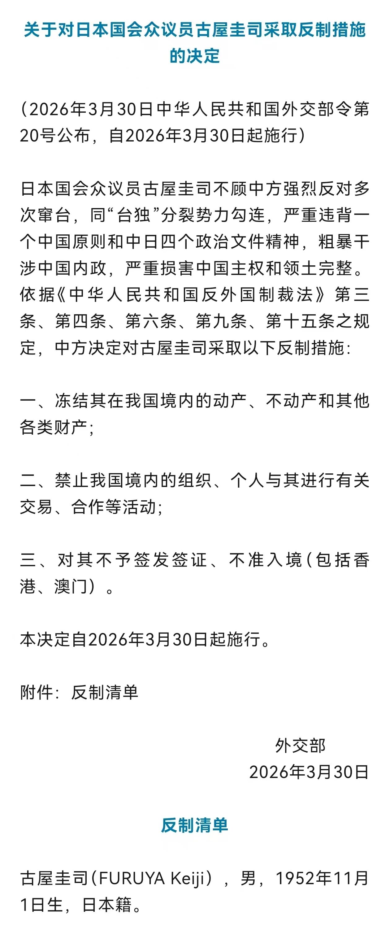 30日,外交部发布对日本国会众议员古屋圭司采取反制措施的决定,全文如下↓(新华社)