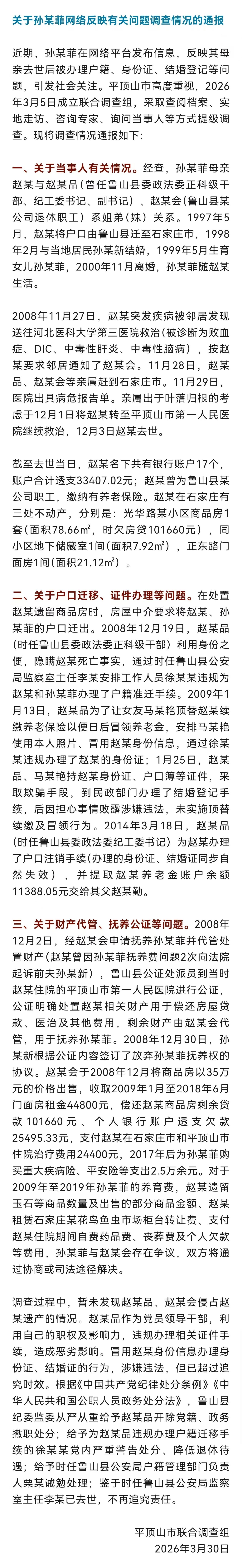 近期,孙某菲在网络平台发布信息,反映其母亲去世后被办理户籍、身份证、结婚登记等问题,引发社会关注。平顶山市高度重视,3月5日成立联合调查组,采取查阅档案、实地走访、咨询专家、询问当事人等方式提级调查。现将调查情况通报如下↓(新华社)