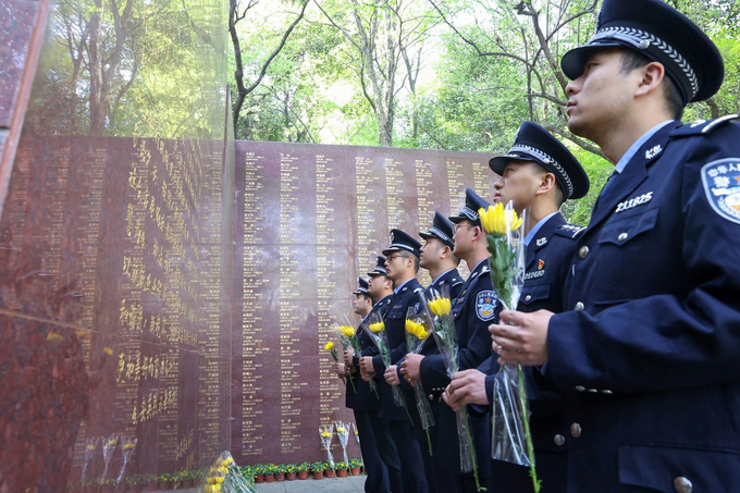 清明节期间,南京公安开展多种形式的祭奠活动,深切缅怀为了人民平安幸福献出宝贵生命的公安英烈。图为4月3日,南京特警支队在雨花台江苏公安英烈纪念墙前庄严举行祭奠活动。 □通讯员 赵阳 记者 姚宏 摄