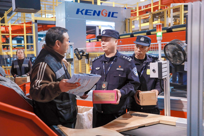 11月3日,淮安市公安局清江浦分局武墩派出所组织民警辅警走进辖区顺丰淮安创新产业园开展安全宣传和隐患排查,确保双十一电商“大促销”期间寄递物流业安全。 □通讯员 金恒 摄