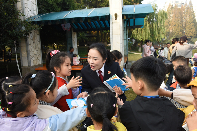 11月14日,金湖县检察院未检干警利用学生“秋游”之际,化身“法治导游”,将生动的普法课堂搬进了层林尽染的景色之中。 □通讯员 仲璐 顾善俊 摄