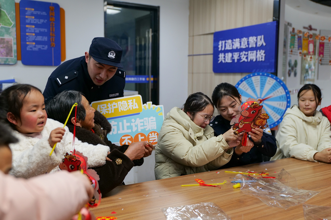 2月28日下午,盱眙县公安局新城派出所依托社区元宵活动,组织民警联合网格员,在做花灯、猜灯谜的热闹氛围中,向老人和孩子普及反诈知识,讲解防骗技巧,守护群众“钱袋子”。□通讯员 郑晨 谢磊 摄