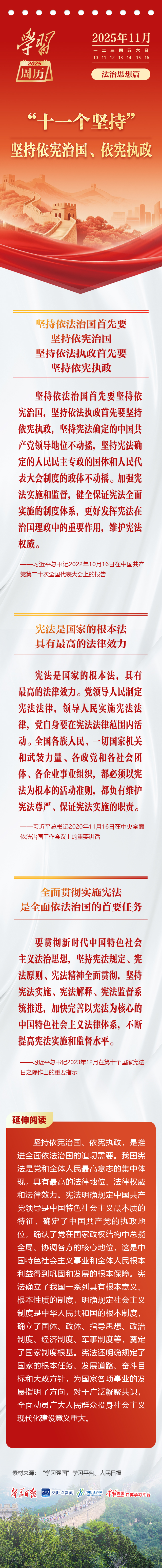 今年是习近平法治思想提出五周年,《学习周历》特别推出“法治思想篇”,深入学习习近平法治思想的核心要义,深刻把握其丰富内涵。本期,让我们一起学习“坚持依宪治国、依宪执政”。