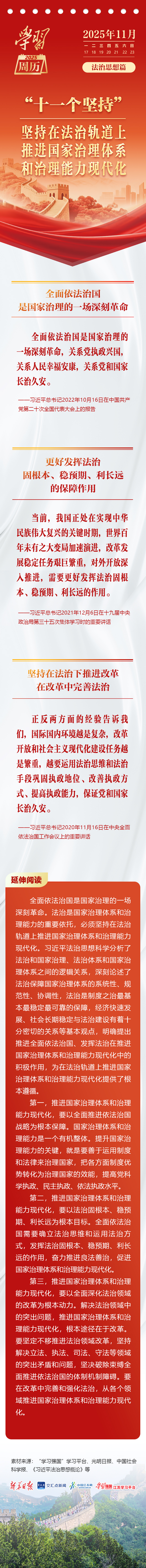 今年是习近平法治思想提出五周年,《学习周历》特别推出“法治思想篇”,深入学习习近平法治思想的核心要义,深刻把握其丰富内涵。本期,让我们一起学习“坚持在法治轨道上推进国家治理体系和治理能力现代化”。