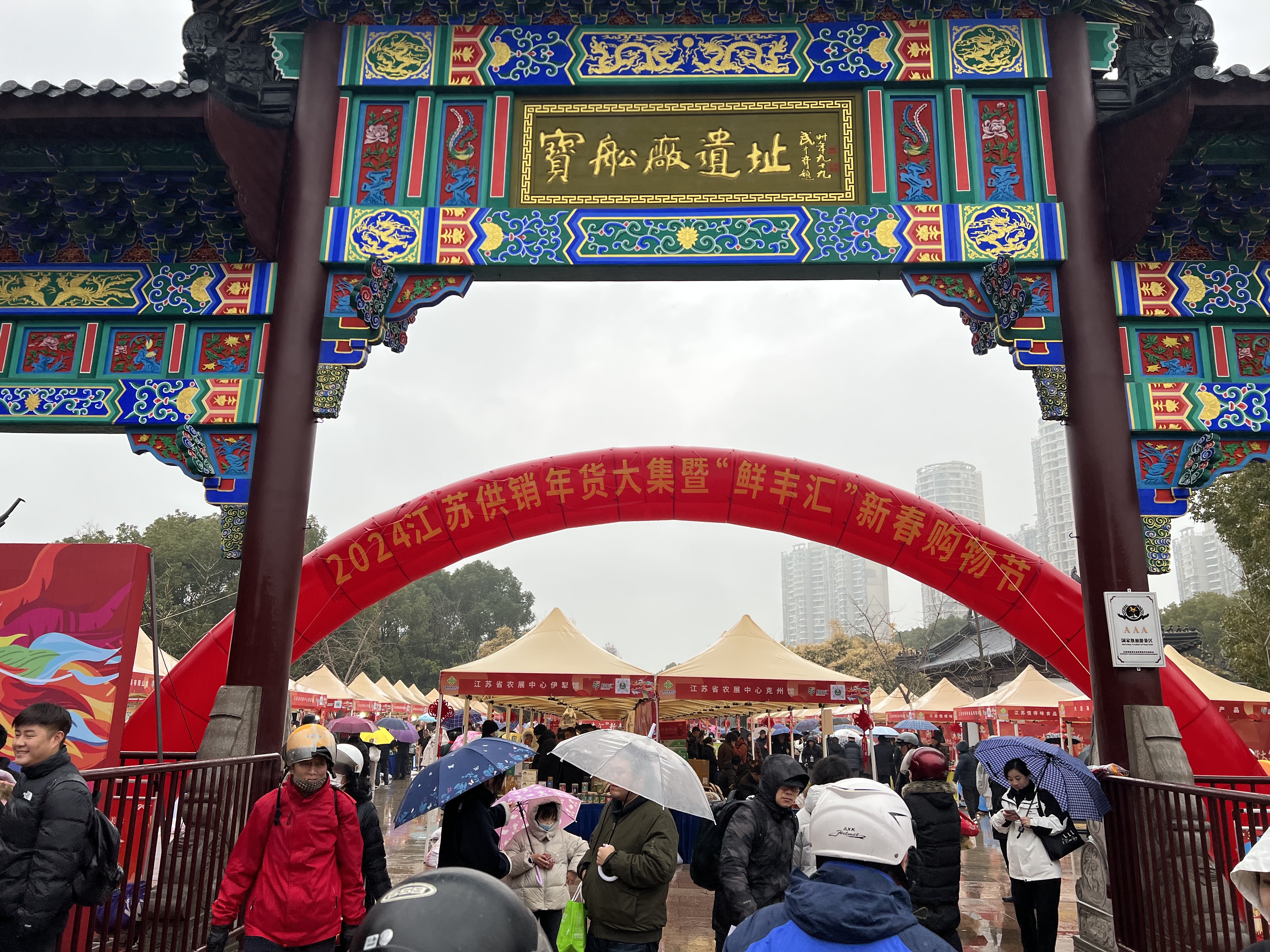 无独有偶。19日一早,在南京宝船厂遗址公园,江苏供销年货大集暨“鲜丰汇”新春购物节连续三天热闹开市。即便细雨绵绵,也挡不住人们逛集市的热情。记者在现场看到,各地特色美食、手工艺品等琳琅满目,吸引了众多消费者前来“大采购”。
