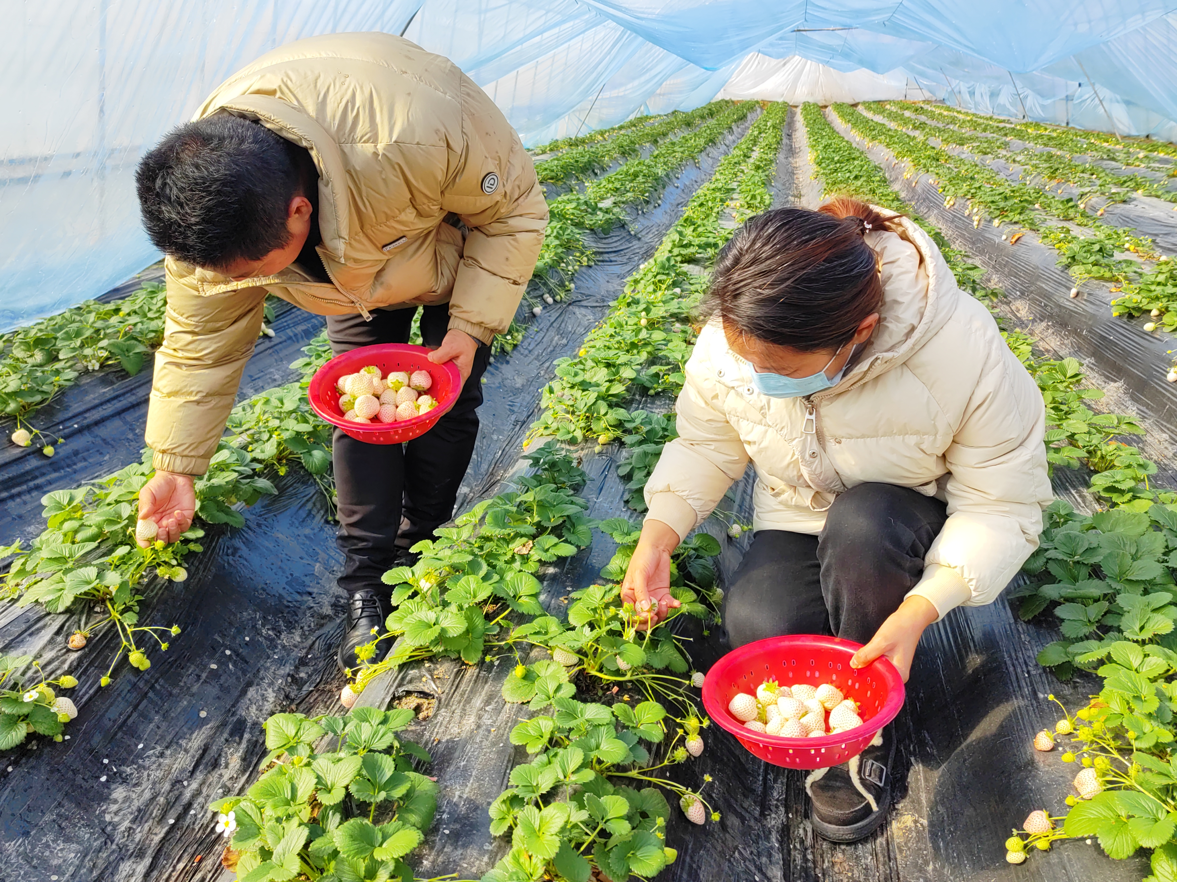 行走在大棚中,王鹰懿和李静熟练地弯腰摘果。“雪兔的口感和传统的红色草莓不同,味道更清甜,有淡淡的水蜜桃香。”李静说,“因为果皮较薄,摘的时候要特别小心不要弄破。”王鹰懿告诉记者,几年前发展特色种植业时,年轻人无心种地、老年人无力种地,村里成立了合作社,由村集体负责运营,村干部领头种植。