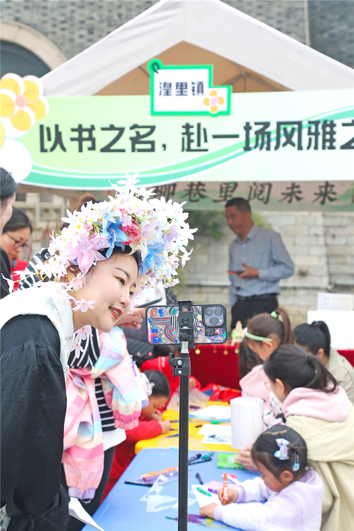 “我手里这本书是《湟里故事志》,书中有两位经典人物,卧冰求鲤的王祥与独退群寇的王孝子,现场我们准备了以他们为原型的皮影制作体验活动……”一旁,头戴簪花的湟里镇综合文化站副主管乐栎,正在摊位前直播市集盛况,不少粉丝心动留言。今年上小学二年级的王瑞弘,边听工作人员讲人物典故,边给皮影上色,表情十分专注,妈妈十分惊喜:“以前都要拿着书追在他后面跑,没想到今天,他一下子就对书籍产生了兴趣。”