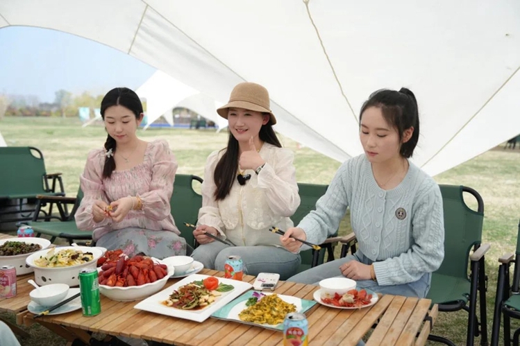 走进白马湖畔的三园度假农庄,只见绿草如茵、杨柳依依、芦苇摇曳,春日气息扑面而来。一顶顶白色的露营帐篷点缀其间,游客们或在草坪上散步闲坐,或在池塘边悠然垂钓,或三五成群围炉煮茶、促膝交谈,纷纷陶醉于清新怡人的美景中。