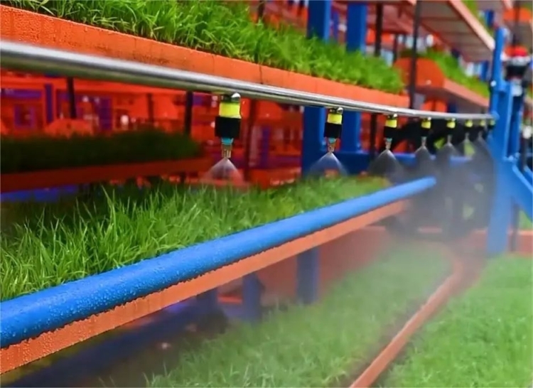 不仅如此,这里还创新在田间修建专用“轨道”,并将航车改造为地轨式秧盘转移设备,从育秧流水线下来的秧盘由机械臂抓放直接坐上“有轨电车”送至田间地头。同时沿着航车边缘铺设有管道、喷头,育秧期间的喷水作业也能轻松完成,相比传统模式节省近一半劳动力。