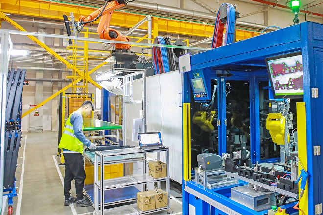 抓取、旋转、扭身,一台台精密设备高速运转,一架架智能机械手臂实现自主控制与交互协作……在格拉默车辆部件(常州)有限公司最新投用的车间里,生产线上的“大黄蜂”们正井然有序地制作着理想L6副仪表台。