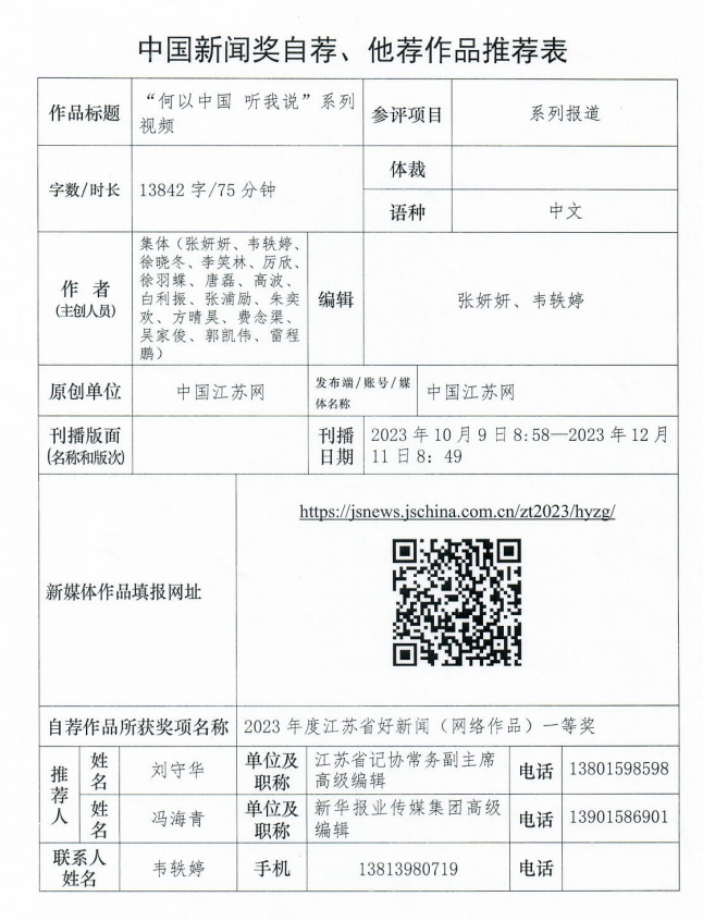 中国江苏网《何以中国 听我说》系列视频作品拟通过自荐(他荐)作品的形式推荐参评第三十四届中国新闻奖评选。根据评选办法的规定要求,在网上进行公示,公示日期为2024年4月28日至5月7日,在此期间,社会各界可通过电话、传真等方式发表评议意见,逾期不再受理。