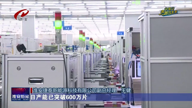 总投资约130亿元的淮安捷泰新能源科技有限公司,是涟水县最大的新能源产业引进的链主型项目,带动多家产业链项目落户涟水,计划打造全球单体最大、智能化程度最高的N型太阳能电池片制造基地。淮安捷泰新能源科技有限公司副总经理王健说:“目前企业36条生产线全部处于满产满销状态,日产能已突破600万片,高效电池片量产转化效率已突破26%,在行业内处于领先地位,投产以来已经申请93项技术专利。”
