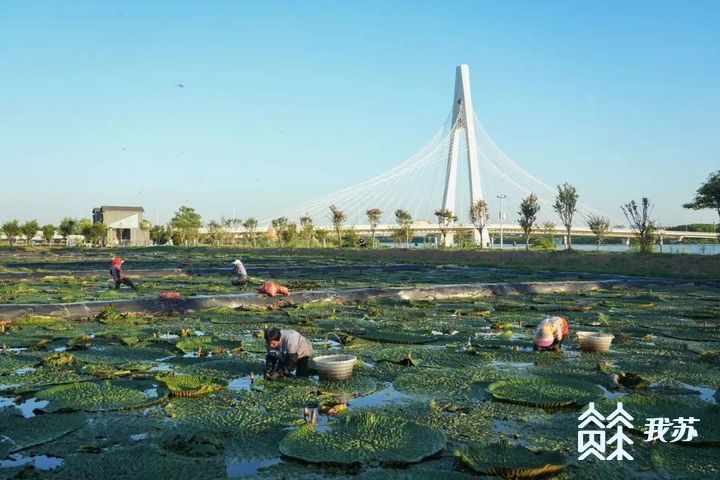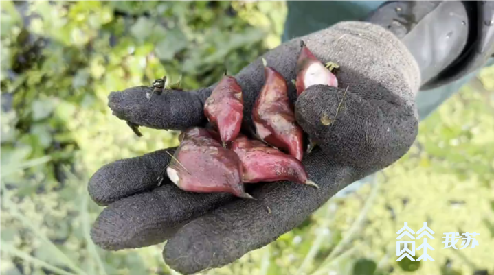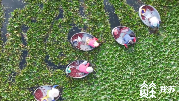 同样迎来菱角采收季的,还有镇江扬中市八桥镇永胜村红菱基地。工人们正忙着采收新鲜菱角,半天能有七八十元收入。50亩的菱塘能卖上二三十万元,成为当地夏日特有的丰收景象。