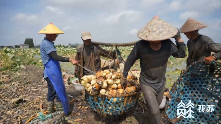 三伏天,镇江扬中三茅街道兴华村的藕迎来了采摘旺季。在一处藕塘边,藕农们正忙着将刚挖出来的新鲜藕运往岸边,经过冲洗、分拣、称重、装车等步骤,运往各地上市。