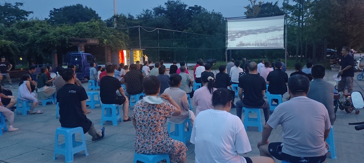 “今晚放《飞驰人生2》,早早地吃过晚饭就来了!”“平时一个人在家看电视没有这种氛围,还是这种老式电影看起来有感觉。”围坐在大幕布前的村民们一边看着公益广告等电影放映一边说道。