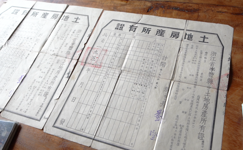 山,见证着余村。俞金宝珍藏着两张20世纪50年代的地契,上面清晰地标明一座山的所有权。“这是佳慧奶奶的嫁妆。她是从隔壁村嫁过来的,那时候家里条件不好,我外公就把这个山调换过来给我妈,当时的山也就是砍砍柴火用。”